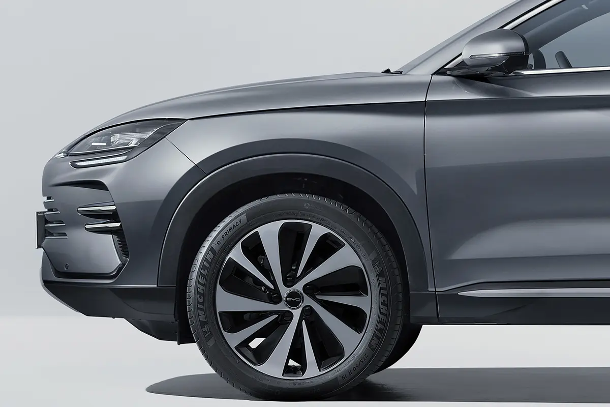Die aerodynamischen 19-Zoll-Räder des BYD SEAL DM-i vereinen Eleganz und Effizienz. Die umsichtig konstruierten Räder unterstreichen nicht nur den sportlichen Look dieses sportlichen PHEV, sie minimieren auch den Luftwiderstand und sorgen für eine ruhige, angenehme Fahrt.